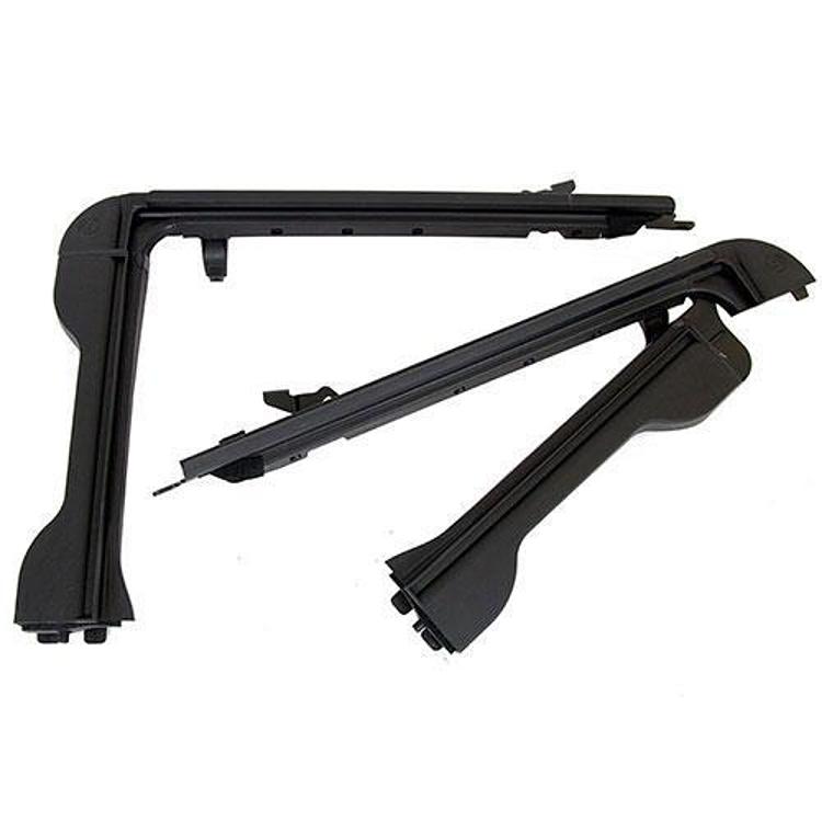 Supertop NX Black Twill complete top with OEM style hardware. Bestops factory style soft top comes complete with factory style door surrounds, factory style windshield channel, Matte Black Twill fabric and tinted windows. PLUS, a Top Arch to support the fabric, quick release bow knuckles for tool-less top removal and a new adjustable plate to maintain top taughtness. Matte Black Twill fabric is the same fabric used in all sorts of expensive sports cars and European luxury cars. Instead of the normal Jeep vinyl, this fabric is much more luxurious feeling, much more cloth-like. it is also the heaviest fabric Bestop has ever used, so it is not only a lot quieter, it is going to help stop heat transfer as well. The fabric is actually three heavy layers: Twill on the outside, rubber waterproofing, and finished twill on the inside. It makes the inside of the top look as finished as the outside. Since the fabric is the best ever, Bestop also upgraded and added extra thick 40mil windows and a Limited Lifetime Warranty.