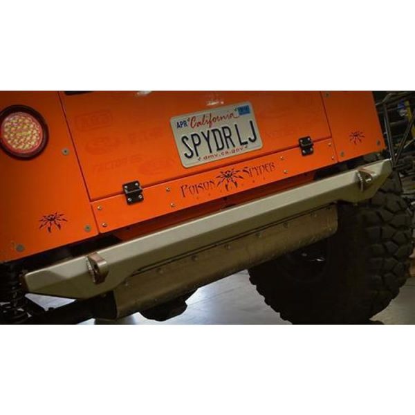 The Poison Spyder Customs BFH II rear bumper is designed for those hardcore four-wheelers who value strength, simplicity and function. This bumper was literally “Built For the Hammers” designed with light weight, toughness and performance in mind. It is basically a “frame cap” style bumper, hugging the rear end of the Jeep’s frame and cross member to provide the best obstacle clearance and departure angle possible. But unlike other frame cap bumpers that are on the market, the BFH II incorporates signature Poison Spyder style, with multiple angles and facets to give the bumper great looks on top of its hard core functionality. The BFH II is CNC laser-cut from high strength 3/16″ plate steel, then precision brake-formed for an exact fit over the Jeep’s rear frame and cross member. The heavy duty recovery shackles are CNC machined from 1″ thick plate steel, and welded both inside and outside the bumper shell. The tabs are standard equipment on the BFH II, and are designed to accept 3/4″ recovery shackles (AKA “D-Rings”). This bumper is available in bare steel only, it will need to be painted or powder coated prior to final installation. The BFH II Rear Bumper is easily installed using captured grade-8 hardware and the Jeep’s existing bumper mounting holes. This bumper is intended for those hard-core wheelers who either wheel without a spare or strap the spare down into the bed of the Jeep.
