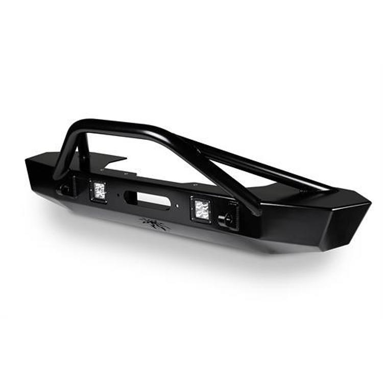 The Bruiser MID front bumper for JK is a mid-width heavy duty bumper with extra protection for the grille and tires. A recessed winch mount provides allows free airflow to the radiator and a lower center of gravity. This bumper is fabricated from 3/16″ plate steel, CNC laser-cut and precision brake-formed into a low profile, high clearance design for optimum off-road performance. The ends of the bumper extend far enough to protect the lower corners of the JK grille, but not far enough to hinder tire clearance or tire access to vertical obstacles. This product is finished in black with Poison Spyders proprietary SpyderShell Armor Coat process. Plate Steel Construction: Bruiser series bumpers are fabricated from 3/16″ plate steel, CNC laser-cut and precision brake-formed into a low profile, high clearance design. The ends of the bumper extend to about the middle of the Jeeps tire width to provide extra protection for the grille and corner of the Jeep, while maintaining clearance for up to 37″ tires at full suspension articulation. Recessed Winch Mount: A winch may be installed into a heavy duty winch mount cradle that is separate from the structure of the Bruiser bumper shell. This provides maximum mounting strength for the winch, while also locating it as low as possible within the bumper shell. The recessed winch provides unimpeded airflow through the Jeeps radiator at highway speeds, and keeps the weight of the winch as low as possible to achieve a Low Center Of Gravity. Your winch fairlead mounts directly to the integrated fairlead mount on the front of the bumper, eliminating the need to purchase a separate fairlead mount. The Bruiser bumper is compatible with most Warn, Smittybilt, and other brand winches that use the popular 10″ x 4.5″ mounting pattern, including Warn ZEON series winches up to model 10S. (Poison Spyder ZEON Winch Spacers are not necessary with this bumper). Brawler Bar – The Brawler Bar is modeled after the bar found on our original RockBrawler front bumper. It is a low-profile stinger designed to provide protection to the winch, grille and radiator area. The Brawler Bar is made of CNC laser-notched, NC-bent 1-3/4″ diameter .120″ wall DOM tubing. The complex laser-cut notch allows the Brawler Bar to be welded to two different planes on the surface of the bumper, providing incredible strength. CNC laser notched DOM tube gussets strengthen the Brawler Bar.