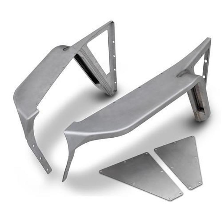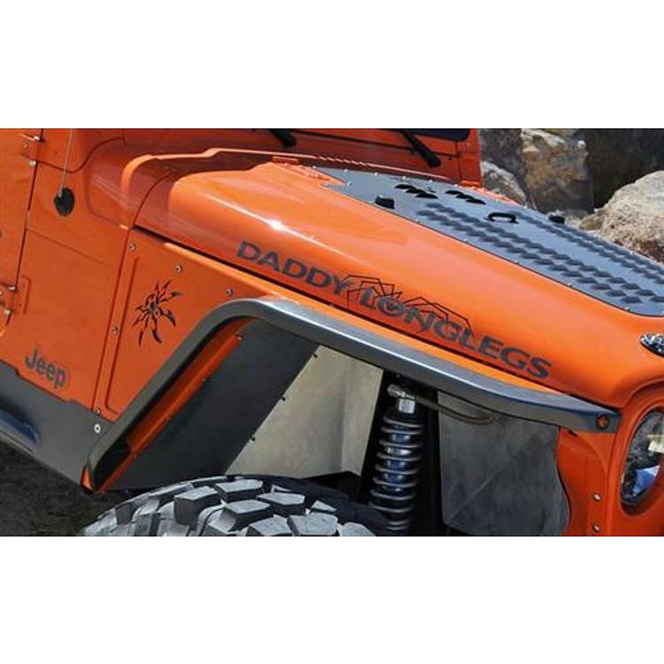 Poison Spyder’s DeFender XC’s provide eXtreme Clearance for big tires without having to install a tall lift, maintaining a Low Center of Gravity (LCOG) and the performance benefits that come along with it. Like our standard DeFenders the XC’s are constructed entirely of CNC laser cut, brake-formed 3/16″ plate steel for strength and style that old school tube fenders just can’t match. The DeFender XC’s provide eXtreme Clearance! Like with the standard DeFenders, the back of the wheel opening is approximately 2 ” further back compared to typical tube fenders, and about 4″ further back than the stock Jeep flares. But the wheel opening on the XC’s is 3″ higher than standard DeFenders, providing Massive Tire Clearance with minimal lift! While there are specific considerations to address with any particular Jeep, in most cases you should be able to run 37″ tires with no suspension lift, and 40’s with just couple inches of lift! The DeFender XC with 3″ Tapered Flare was designed for maximum performance in several aspects. First, it provides the same splash protection of our regular 3″ flare, keeping mud and debris from splashing up onto the side of the Jeep. But rather than having a straight side, the edge of the flare tapers inward toward the front of the Jeep, in a line parallel to the tapered edge of the hood. In this manner it tapers from 3″ at the back, to about the same width as our “Zero Flare” at the front, providing the same great clearance for articulating tires and tight trails that our Zero Flare provides. This Fender will require modification to the factory hood and Poison Spyder’s DeFender XC Inner Fenders #PSC14-02-099 to complete installation.