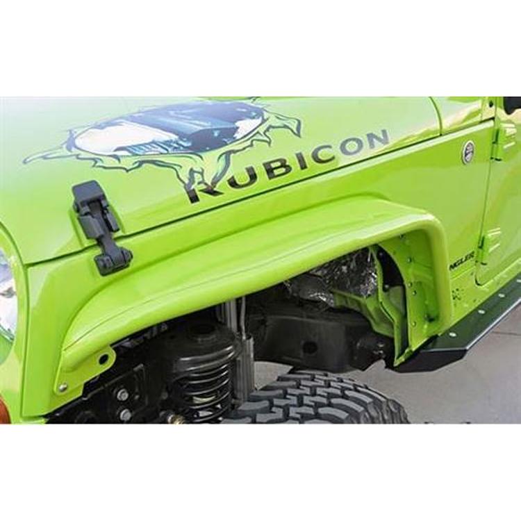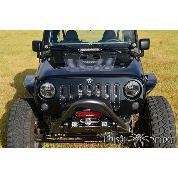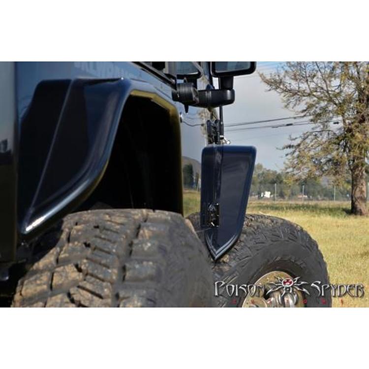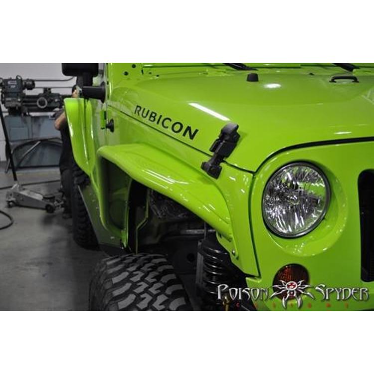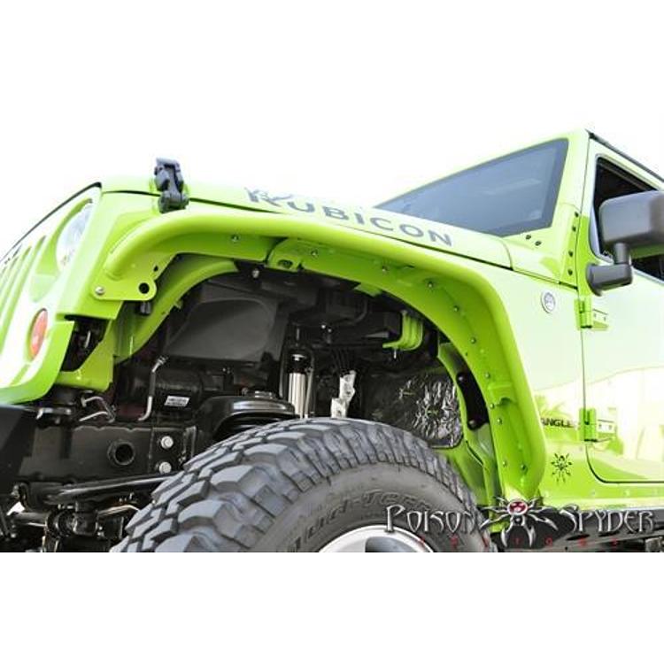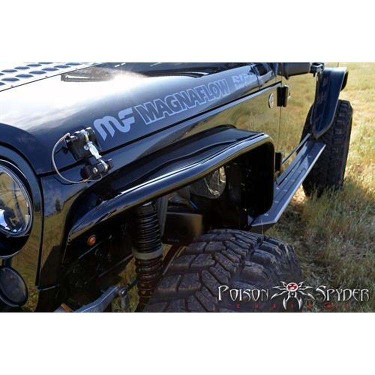 These Narrow JK Crusher Flares are 2″ narrower than our Standard Width Crusher Flares. This gives you 2″ of extra clearance from canyon walls, trees and obstacles on tight trails. These aluminum Crusher Flares are light weight at only 10 lbs. per fender yet durable. The Jeep JK’s thin sheetmetal fenders and stock plastic flares are among the most vulnerable body components when traversing the trail. The Poison Spyder JK Front Crusher Flare kit improves both the aesthetics and durability of your Jeep during your off road adventures. Steel Crusher Flares and Poison Spyder’s exclusive Inner Brace system are the ultimate in front fender armor for your JK, with the toughness to withstand punishing scrapes with granite canyon walls. This product ships as bare steel it will need to be painted or powder coated prior to final installation.