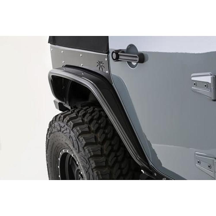 Poison Spyders Crusher Flares add hard core durability and great looks to your Jeep JK. Like in the front, the original equipment rear flares are flimsy plastic which can tear off and are easily damaged on the trail. Poison Spyders Rear Crusher Flares for JK are all-steel, precision-fabricated replacements that are built to handle extreme terrain. The Poison Spyder JK Crusher Flare provides tire coverage for up to a 40″ tire (minor trimming of the inner sheet metal may be required for tire clearance). The Crusher Flares mounting plate is made of CNC laser cut 3/16 plate steel that has been brake-formed to fit the contours of the JKs flare mounting surface like a glove. The Crusher Flare rails are CNC-bent 1.5″ X .120 wall DOM structural tubing, with a fender surface made of 1/8″ laser-cut plate steel. The Crusher Flare mounts using stainless steel countersunk flat head cap screws that provide a low profile, great looks and corrosion resistance. Installation requires drilling and installation of the provided nut-sert fasteners. Poison Spyder supplies a simple nut-sert installation tool to facilitate the process. Crusher Flares are sold as bare steel. For added structural rigidity when hardcore wheeling, Rear Crusher Flares come with a 4-piece Inner Brace Kit. The Inner Braces are engineered to provide the internal structure to keep the Crusher Flares from deforming the Jeeps outer tub sheet metal on impacts. The components are laser-cut and brake-formed to precisely fit between the Jeeps outer sheet metal and the heavier gauge steel of the structural inner tub. The result is a Crusher Flare installation that will withstand serious hits from the rocks.