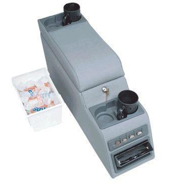 2 sets of cup holders, so front and rear passengers, can safely secure hot and cold beverages. Spring action coin organizer. Extra large comfortable padded armrest. Recessed, removable cooler holds a 6 pack of soda. Locking, large hidden storage area with storage for CDs and cassettes. Does not interfere with fold & tumble rear seat in folded up position. Concealed, lined sunglass holder. Leveling bracket included.