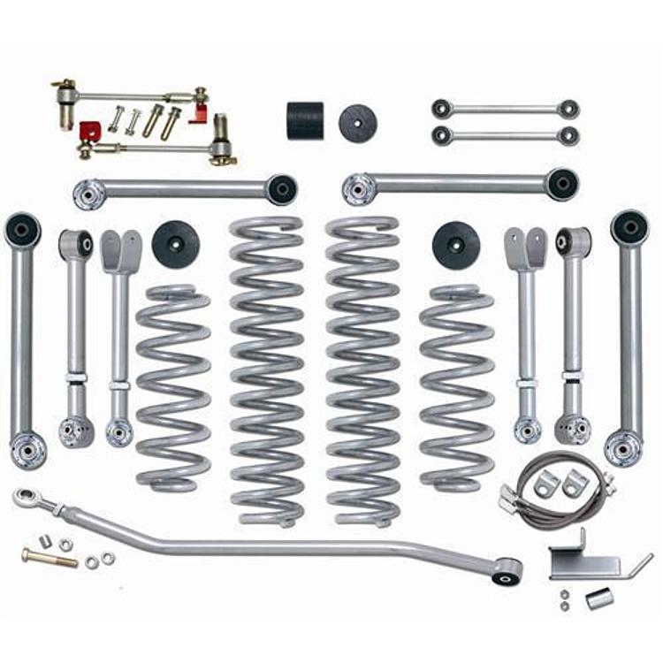 The Super-Flex 3.5″ System is the ultimate suspension system for TJs and LJs currently running the factory short arm suspension geometry. The Super-Flex 3.5″ System is a complete suspension system, featuring 8 new control arms, adjustable upper front and rear with our serviceable Super-Flex spherical ball joints, adjustable front track bar, replacement 4.5″ lift springs, extended bump stops, longer front stainless steel brake lines and Gen II sway bar disconnects. The Super-Flex Suspension System combines superior flexibility and handling. Installing one will give your Jeep the on and off-road performance you’ve been waiting for.