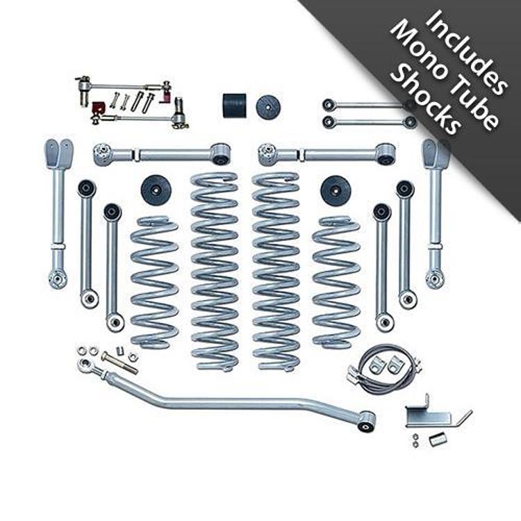 The ultimate suspension system for the TJ or LJ running the factory short arm suspension geometry. The RE7000 Super-Flex is a complete suspension system, featuring new control arms with our Super-Flex spherical ball joints, adjustable front track bar, replacement 4.5-inch lift springs, extended bump stops, longer front brake lines, and Gen II sway bar disconnects.