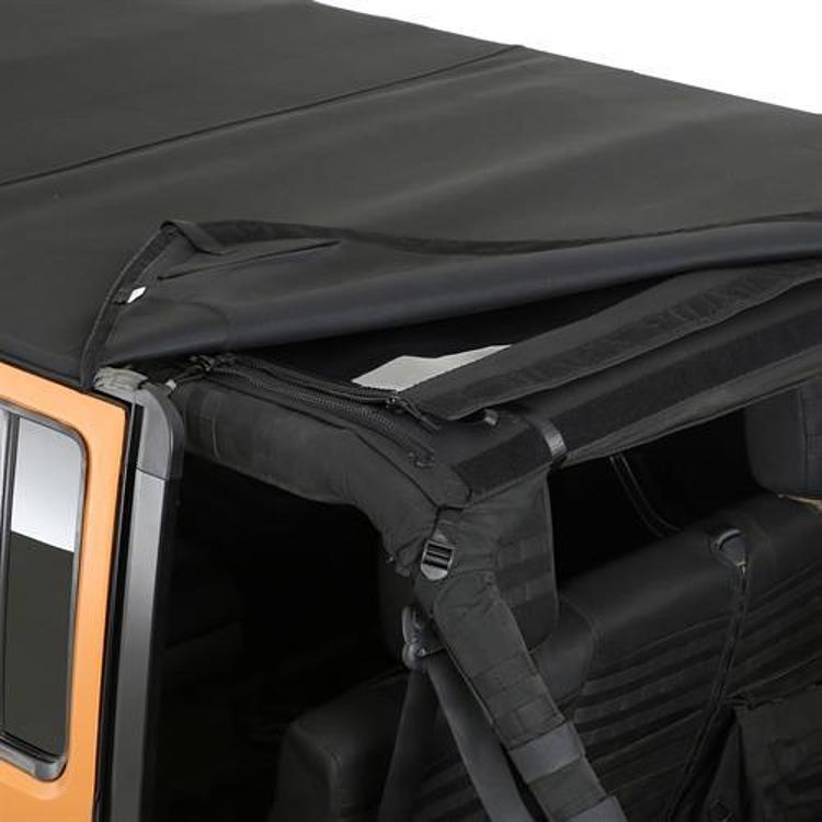 **This top requires door surrounds, tailgate bar and windshield channel for installation (sold separately). The new Bowless Combo Top from Smittybilt is the most adaptable Jeep top on the market. If you’re hitting the trail and clouds roll in unexpectedly you can quickly transform your Jeep so it is protected with a weatherproof full top. When the sun returns, simply zip out the side and rear windows and youre back to crawling in the open air again. Added conveniences includes the internal storage compartments, MOLLE attachment straps and easy access, internal storage of your side and rear curtains.
