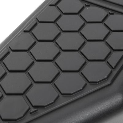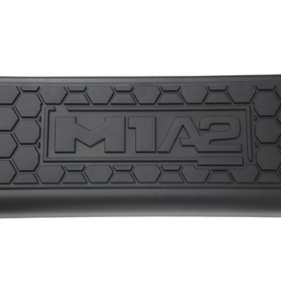 The M1A2 family is completed with the matching side steps, with large radius bends that match the bumpers. The steps mount high and tight for optimal clearance and the .188 inch thick mounting brackets ensure a strong, rigid hold with minimal movement. The bolt-on step plate has a unique hexagonal pattern mirroring the bumpers’ mesh panels and the distinctive M1A2 logo illuminates whenever your door opens.
